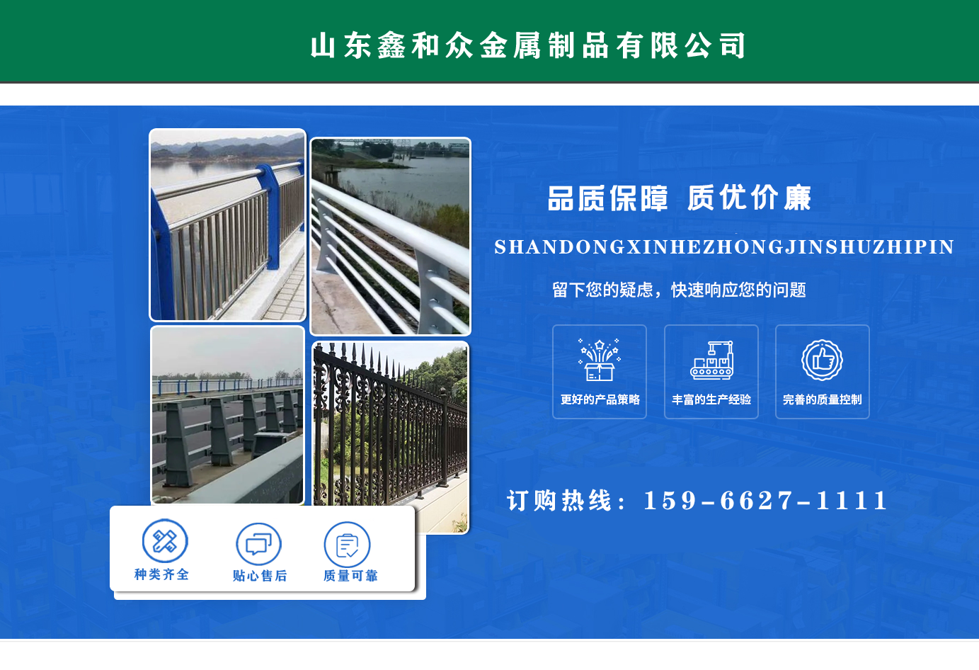 山東鑫和眾金屬制品有限公司主要產(chǎn)品有防撞護(hù)欄,橋梁護(hù)欄,道路護(hù)欄,河道護(hù)欄,不銹鋼護(hù)欄等護(hù)欄。提供設(shè)計(jì)方案,一站式定制,包您滿意價(jià)格優(yōu)惠,歡迎來(lái)電咨詢!    公司常年從事銷售護(hù)欄防撞護(hù)欄,橋梁護(hù)欄,道路護(hù)欄,河道護(hù)欄,不銹鋼護(hù)欄,橋梁鋼護(hù)欄,河道燈光護(hù)欄等。產(chǎn)品廣泛應(yīng)用于橋梁、河道、旅游景區(qū)、道路、公路、公園、小區(qū)、景觀、道路防撞等領(lǐng)域?!   」井a(chǎn)品均采用優(yōu)質(zhì)不銹鋼材料,符合相關(guān)標(biāo)準(zhǔn)。各種型號(hào)不銹鋼復(fù)合管及護(hù)欄,質(zhì)量嚴(yán)格把控。產(chǎn)品強(qiáng)度高、耐腐蝕、焊接牢固、抗沖擊、性能好,防撞護(hù)欄結(jié)構(gòu)簡(jiǎn)單、美觀實(shí)用大方?!    g迎前來(lái)訂購(gòu)!...